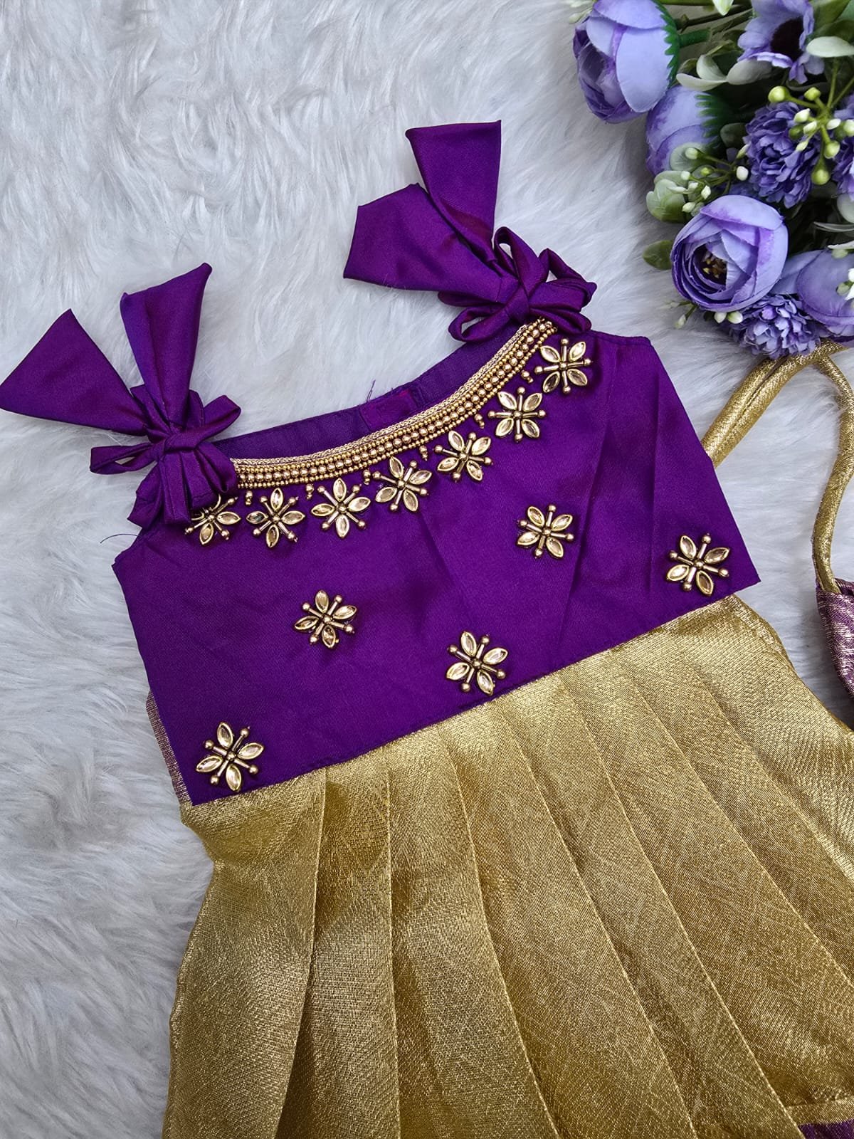 Crafted from luxurious pattu silk, our clothing offers the richness of traditional textiles with the comfort your little one deserves. The fabric is chosen for its soft feel, lustrous sheen, and long-lasting wear, making it perfect for both grand celebrations and casual gatherings.