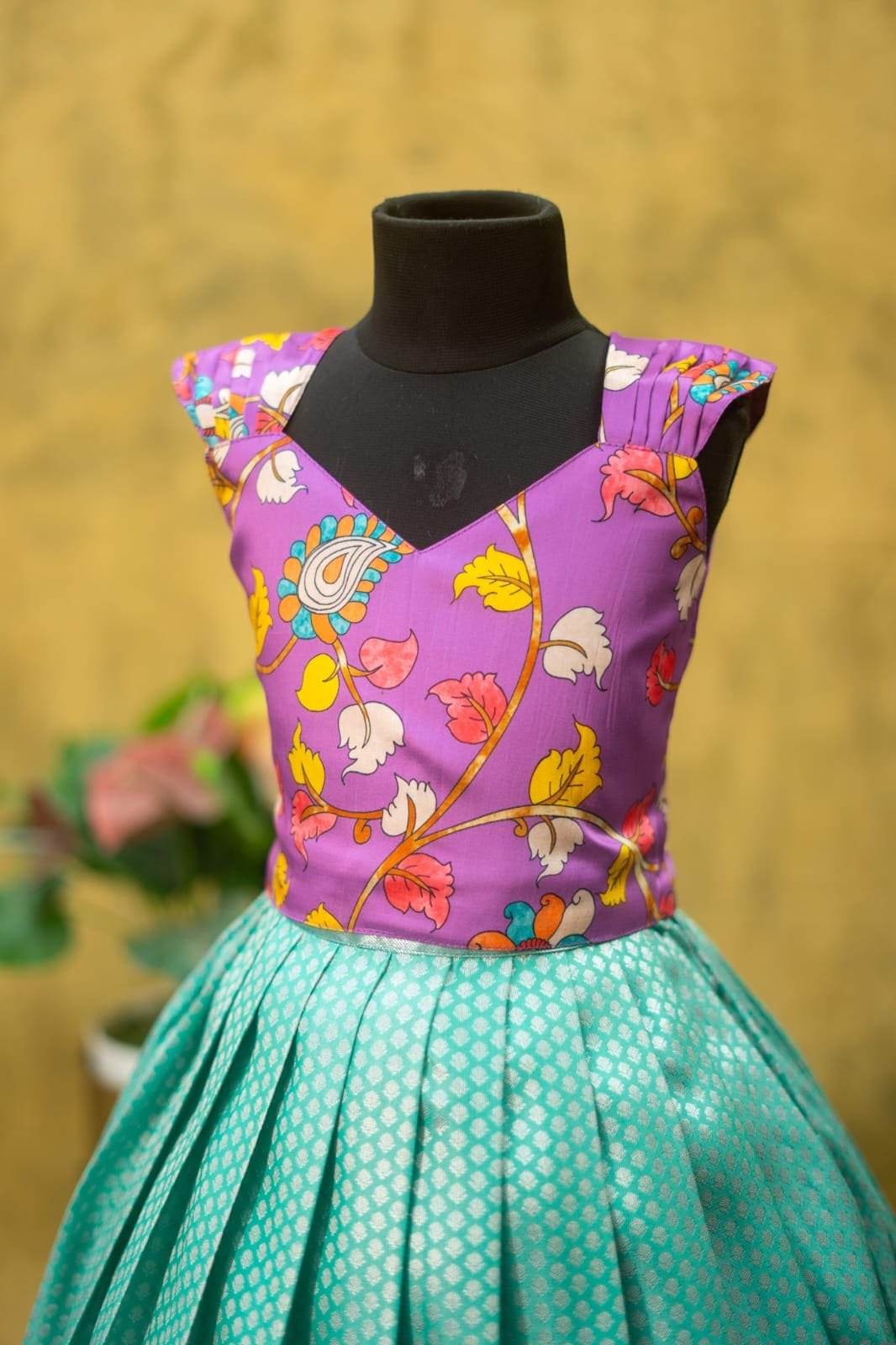 Beautiful Kanchi pattu lehenga paired with a premium kalamkari sleeveless top featuring a cute Mickey Mouse design.