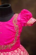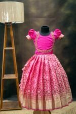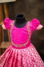 Crafted from luxurious pattu silk, our clothing offers the richness of traditional textiles with the comfort your little one deserves. The fabric is chosen for its soft feel, lustrous sheen, and long-lasting wear, making it perfect for both grand celebrations and casual gatherings.