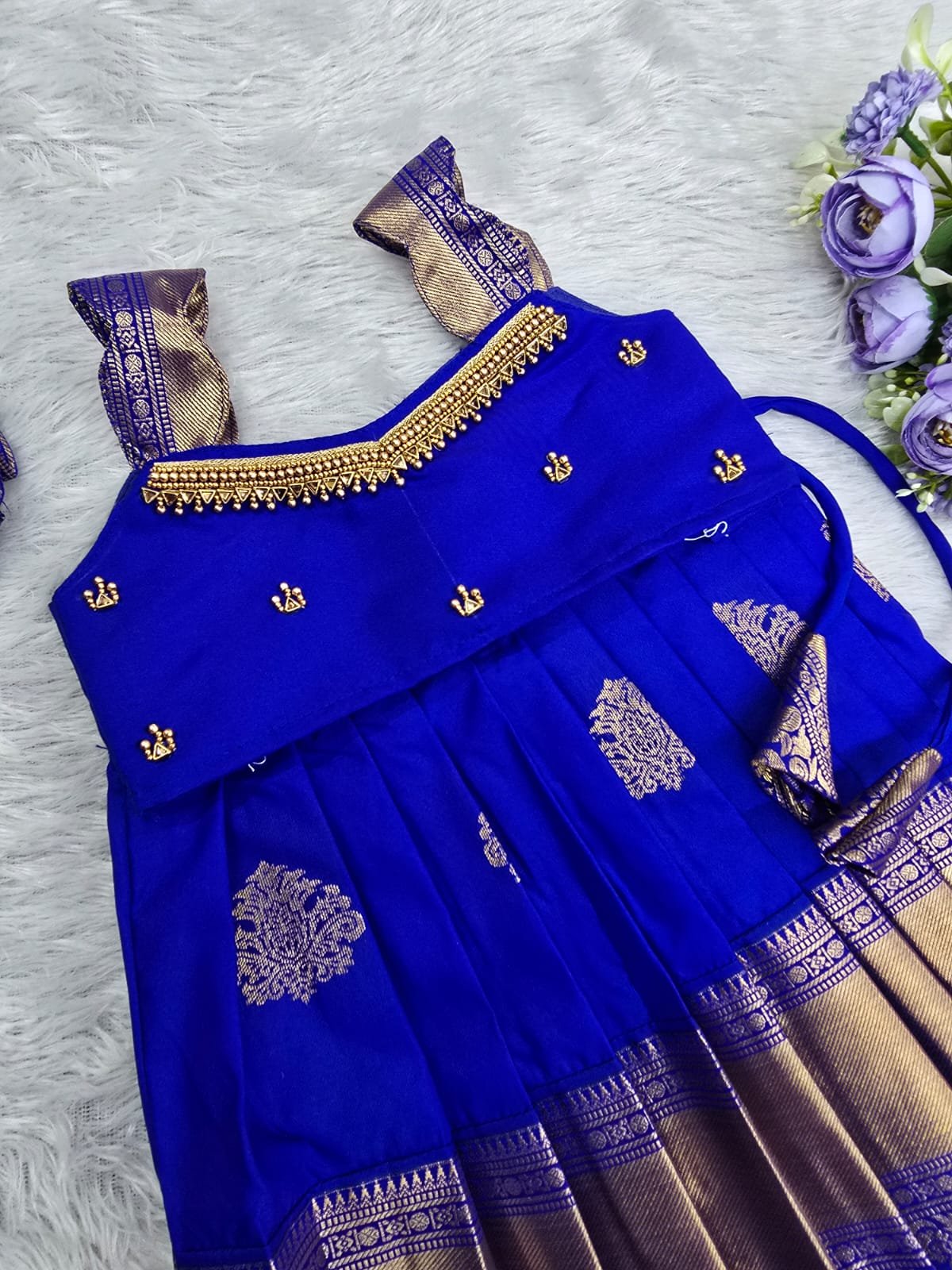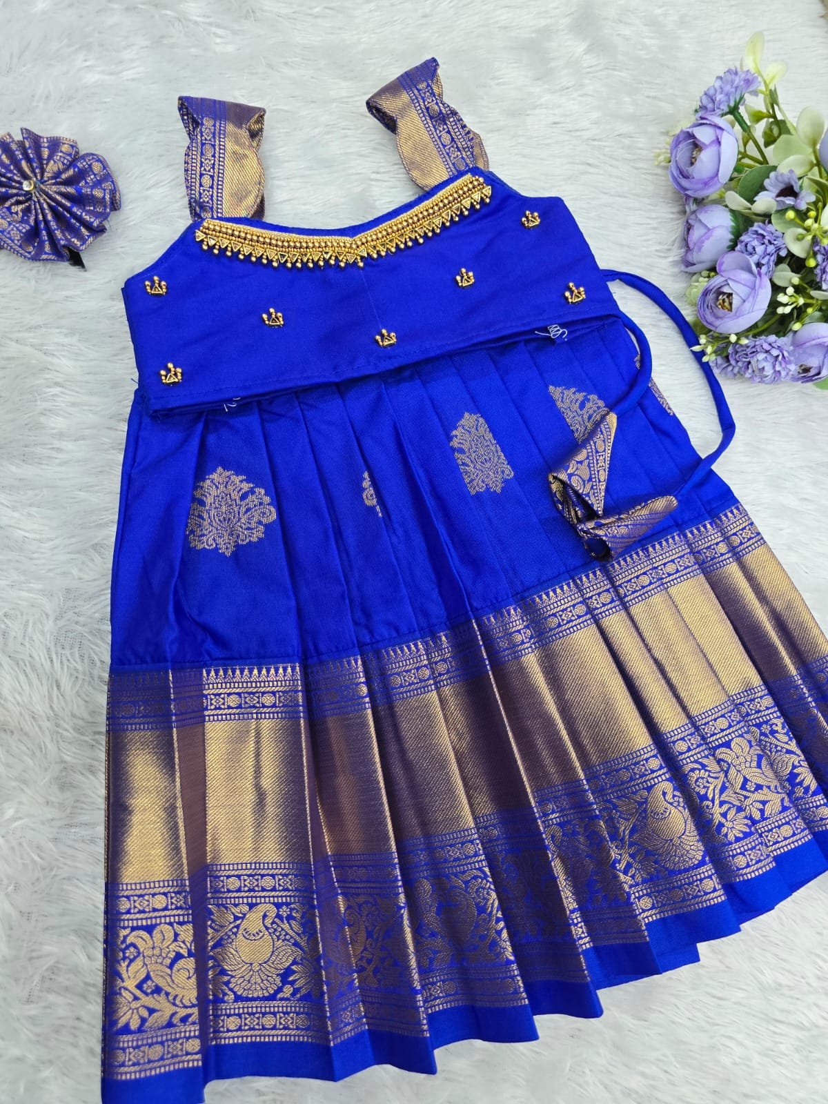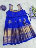 Crafted from luxurious pattu silk, our clothing offers the richness of traditional textiles with the comfort your little one deserves. The fabric is chosen for its soft feel, lustrous sheen, and long-lasting wear, making it perfect for both grand celebrations and casual gatherings.