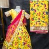A radiant Paithani half saree set in glowing yellow, beautifully adorned with multicolor floral motifs all over. Paired with a pink netted dupatta detailed with lace work, this ensemble is perfect for young women who love ethnic elegance.