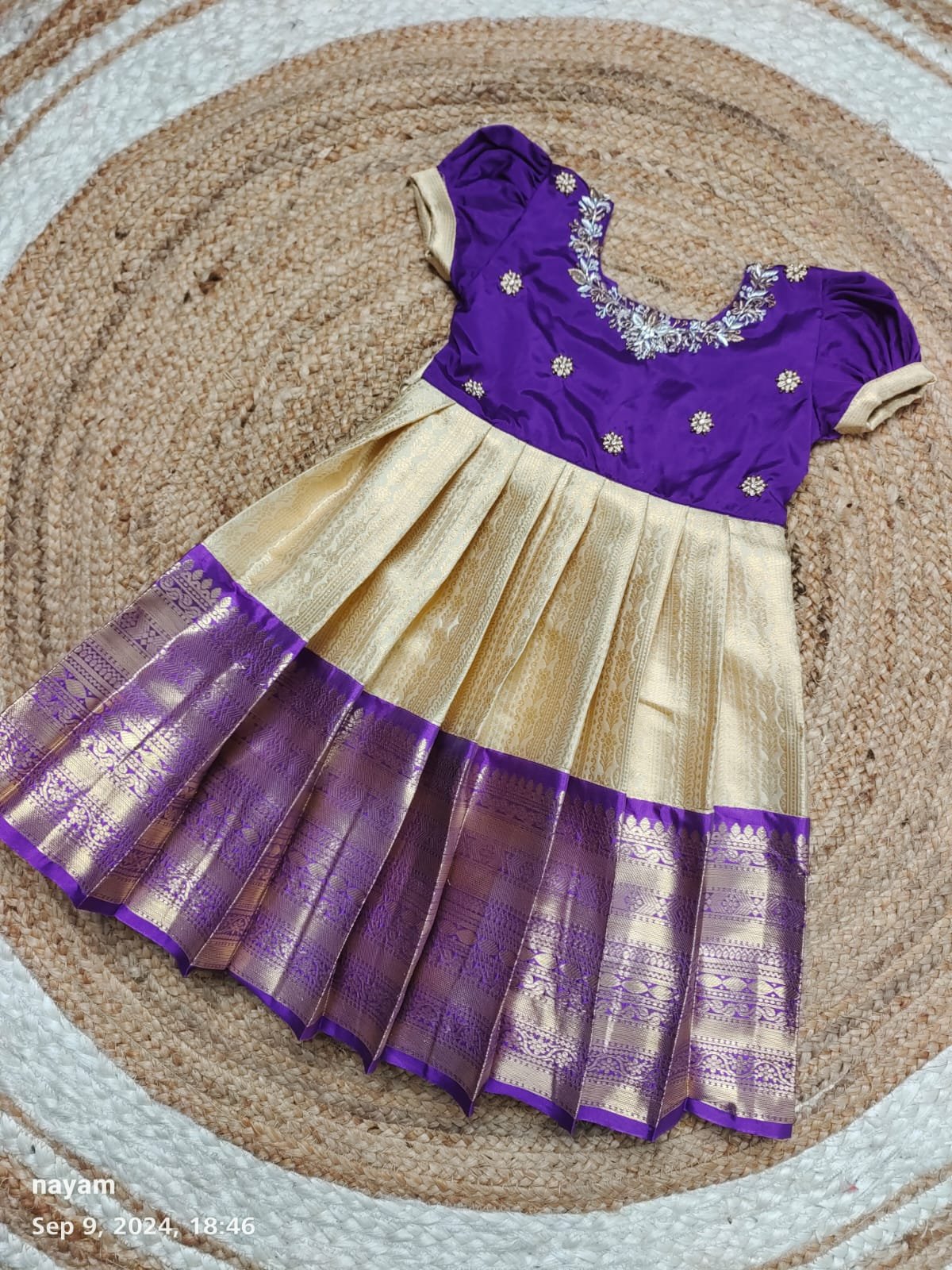 To preserve the beauty and quality of your Prettypattu Pattu Pavadai, Frock, or Half Saree, dry clean only. Store in a cool, dry place away from direct sunlight to maintain its vibrant colors and fine craftsmanship.