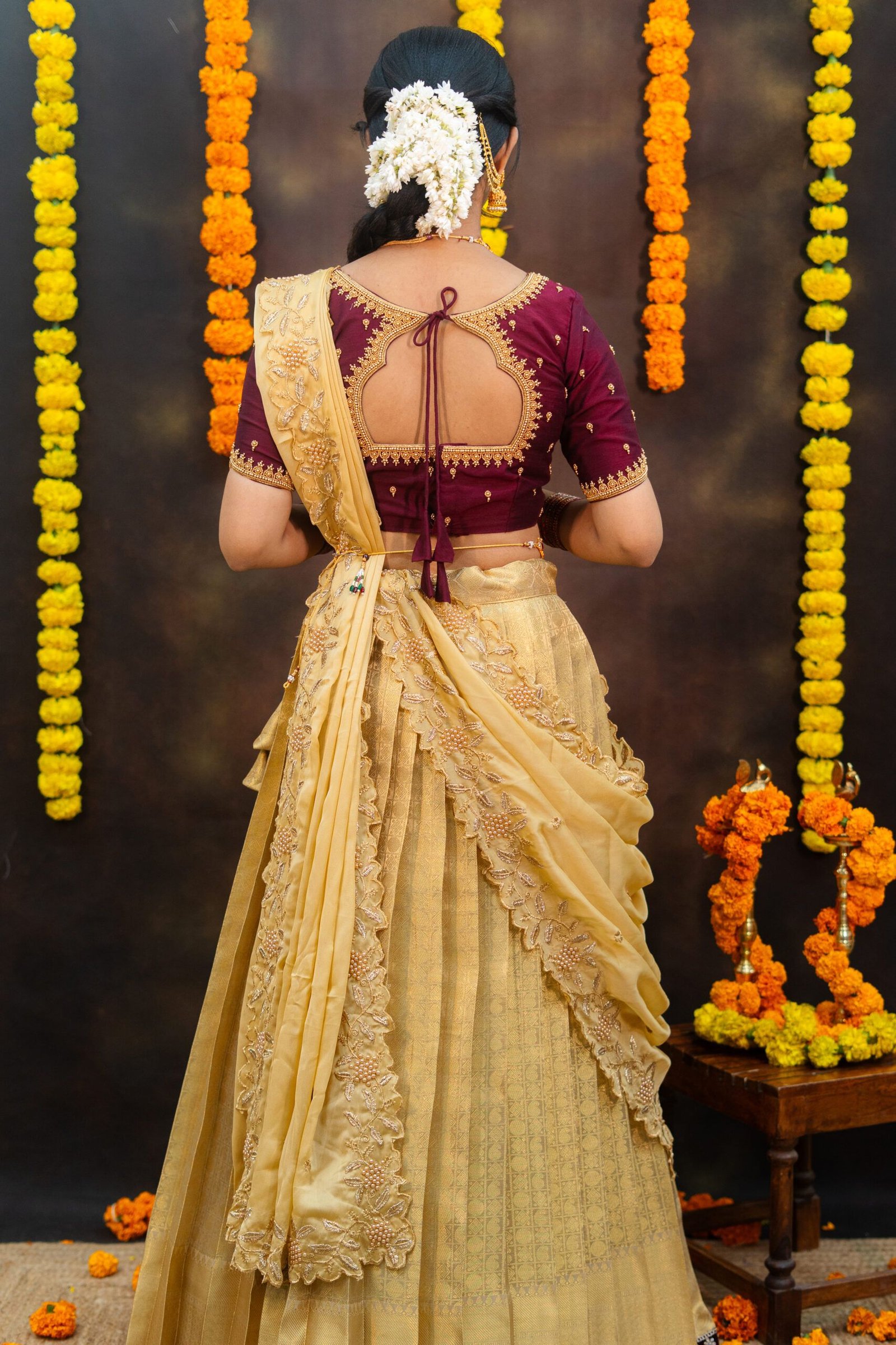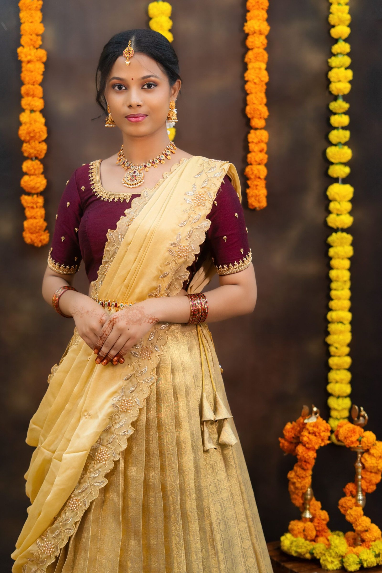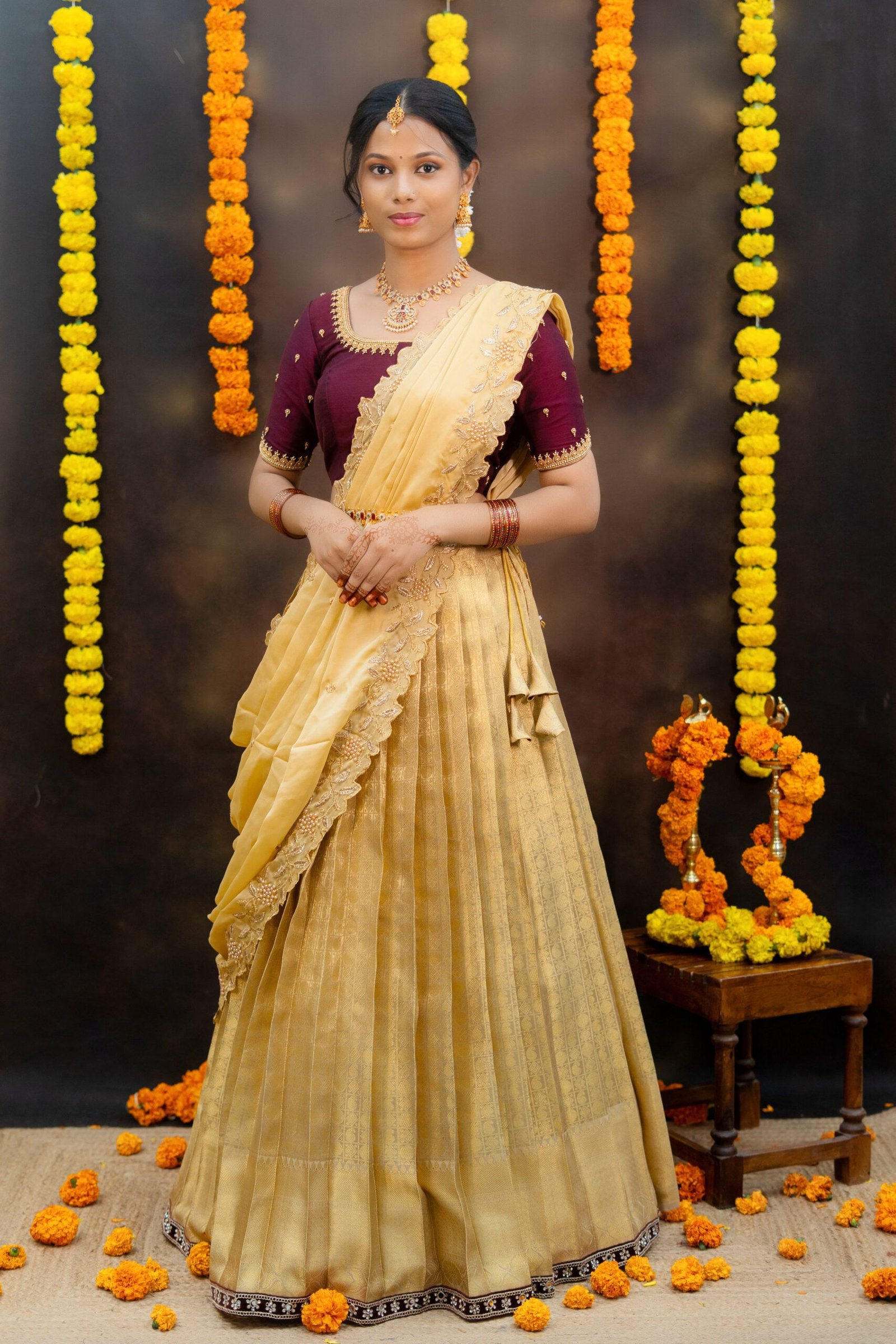A graceful maroon blouse paired with a rich gold pleated lehenga and matching dupatta, beautifully finished with delicate gold detailing. Perfect for festive occasions and traditional celebrations. 💛🌸