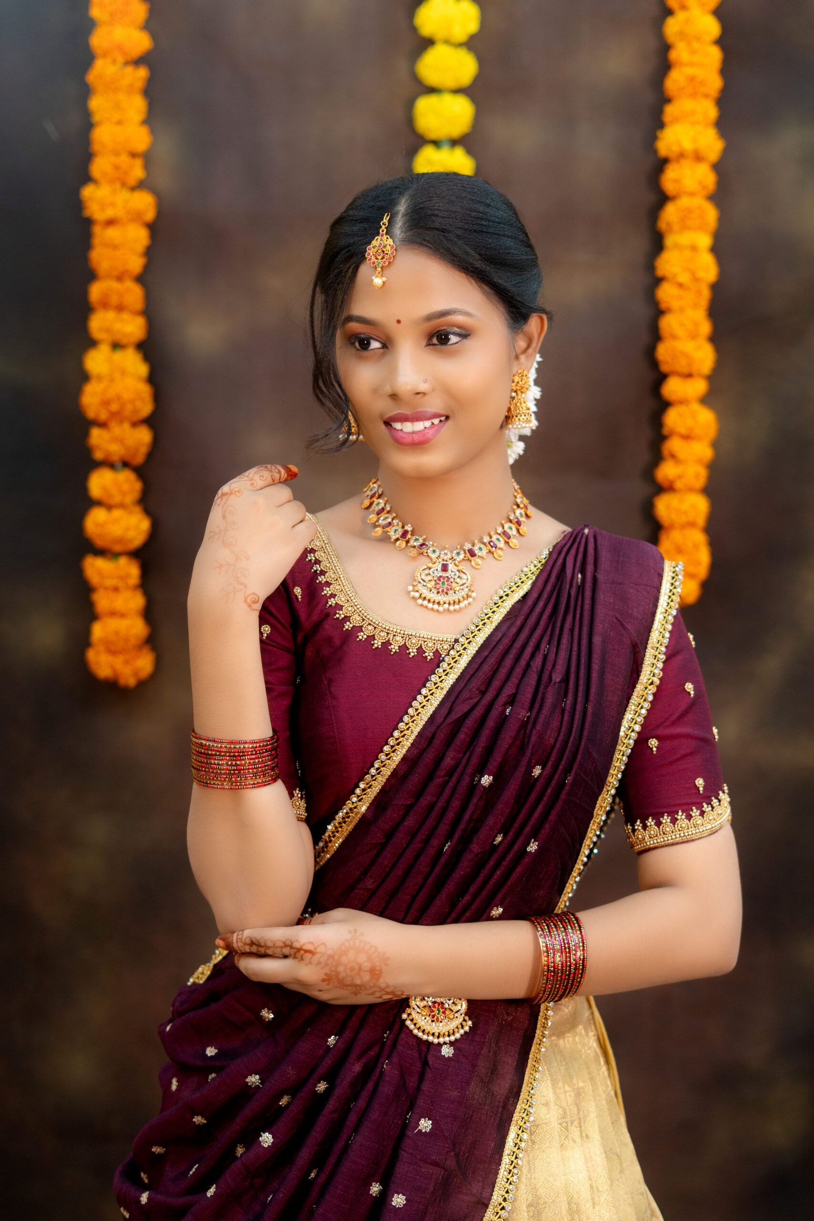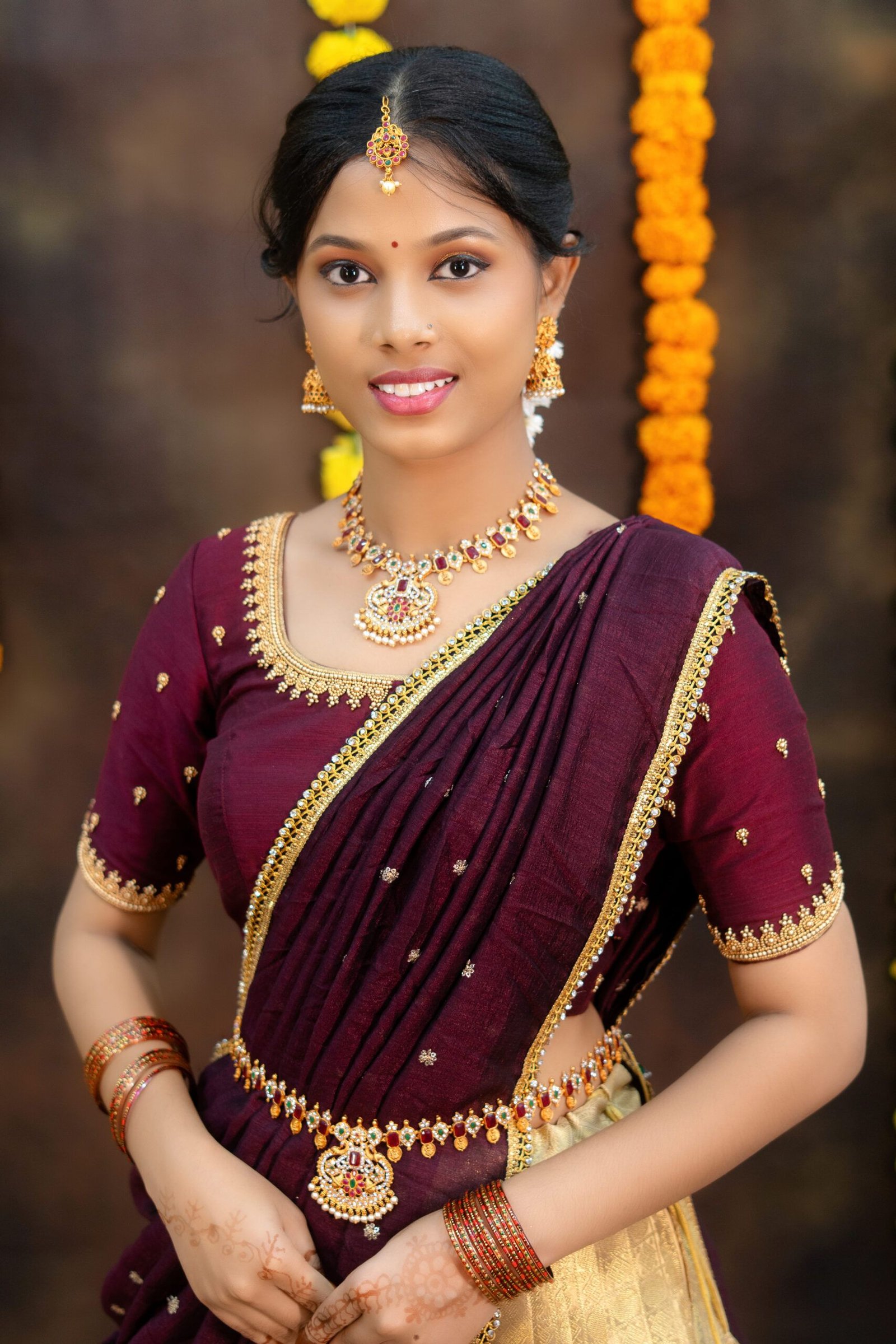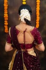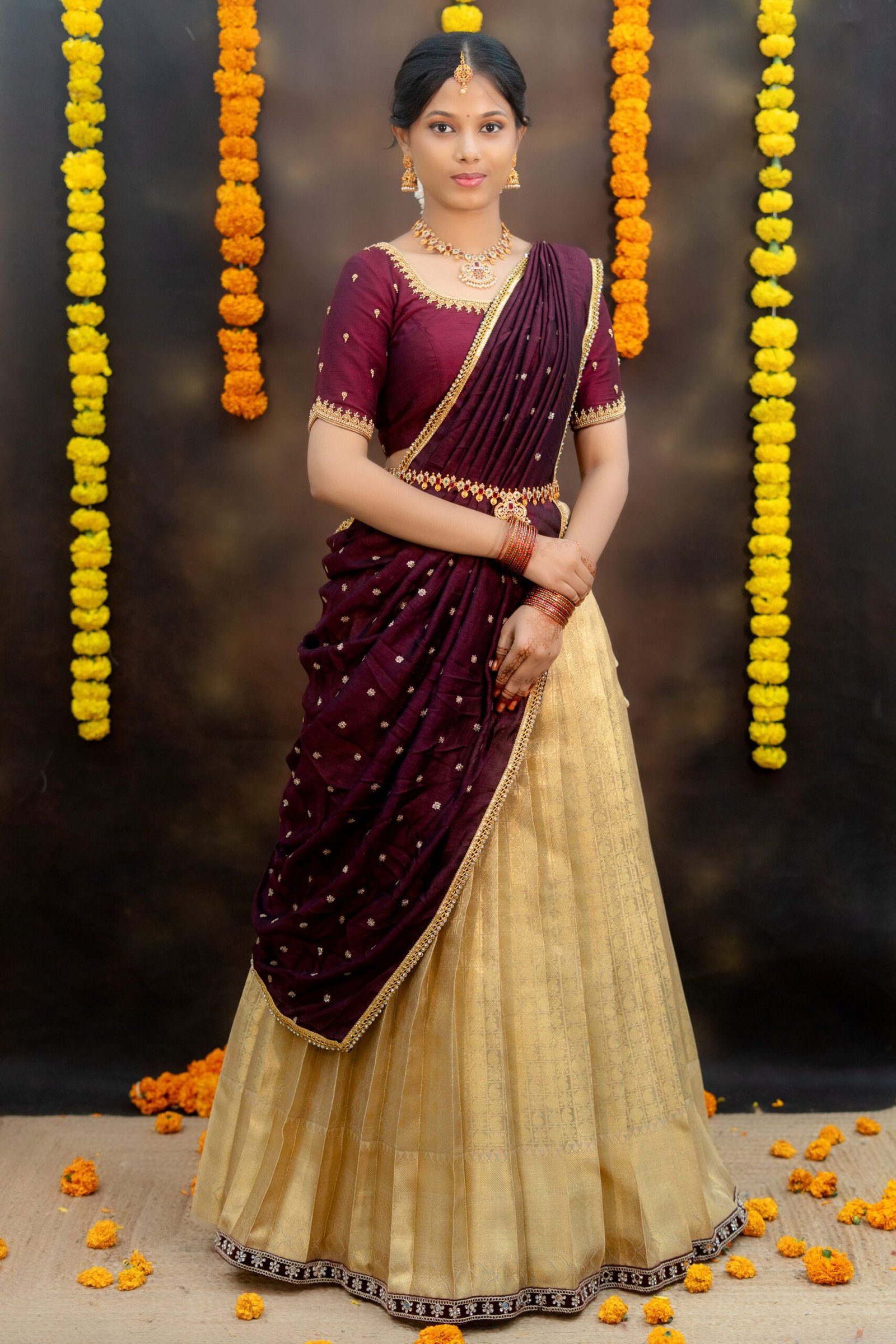 • ✨ Elegant Maroon & Gold Half Saree ✨A graceful maroon blouse paired with