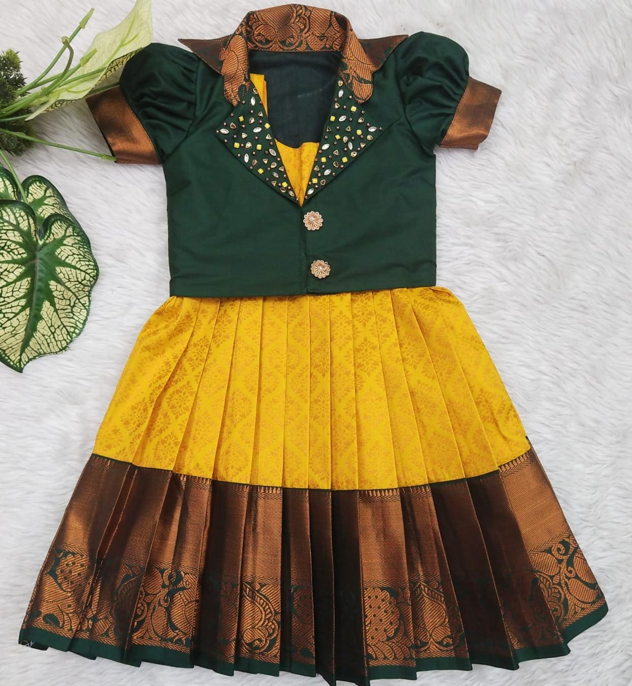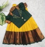 Crafted from luxurious pattu silk, our clothing offers the richness of traditional textiles with the comfort your little one deserves. The fabric is chosen for its soft feel, lustrous sheen, and long-lasting wear, making it perfect for both grand celebrations and casual gatherings.