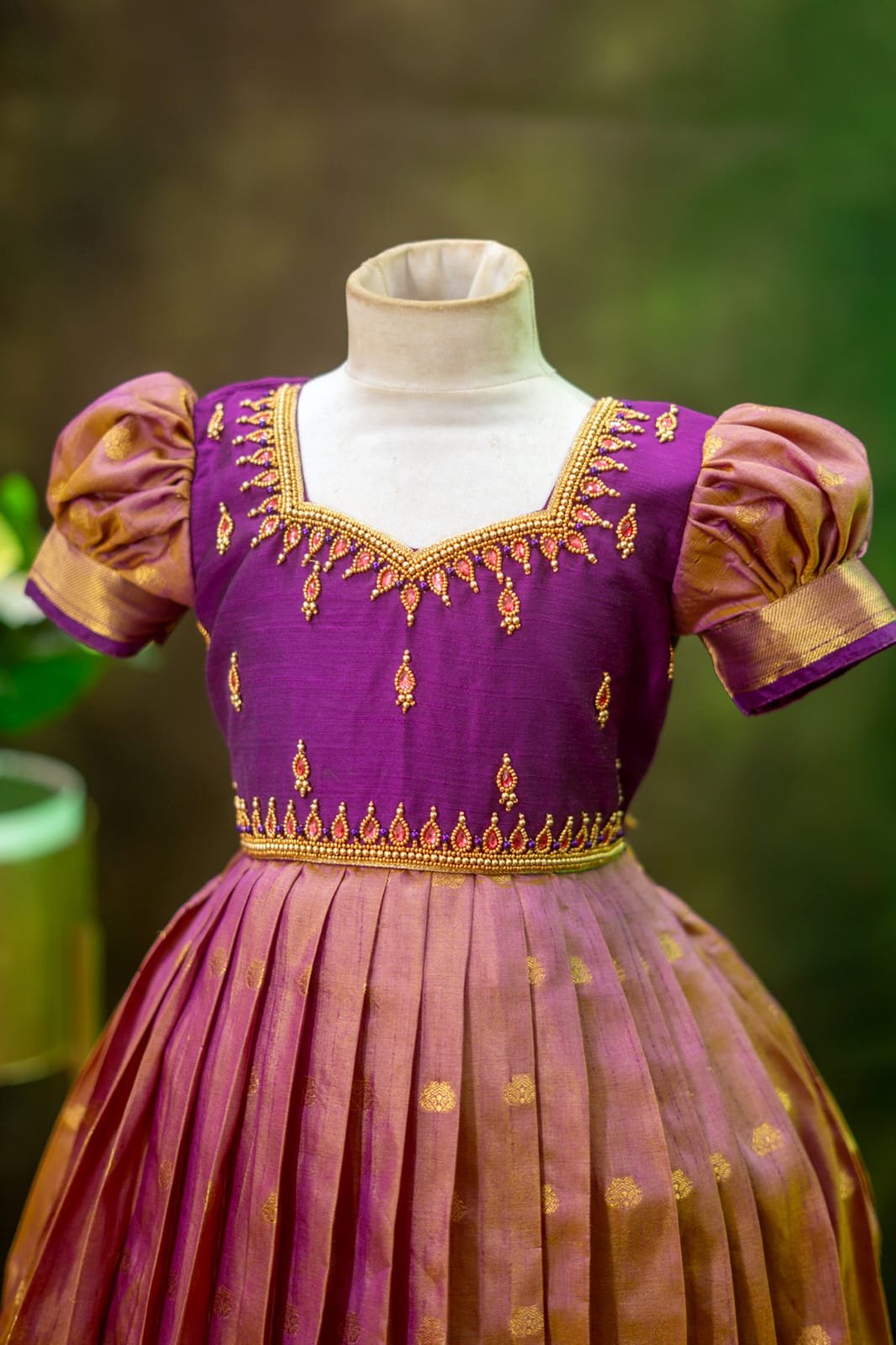 • This beautiful kids dress is crafted from rich semi Banarasi fabric, featuring a graceful pleated skirt with elegant zari butta detailing and a traditional woven border.