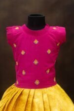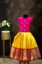 Crafted from luxurious pattu silk, our clothing offers the richness of traditional textiles with the comfort your little one deserves. The fabric is chosen for its soft feel, lustrous sheen, and long-lasting wear, making it perfect for both grand celebrations and casual gatherings.