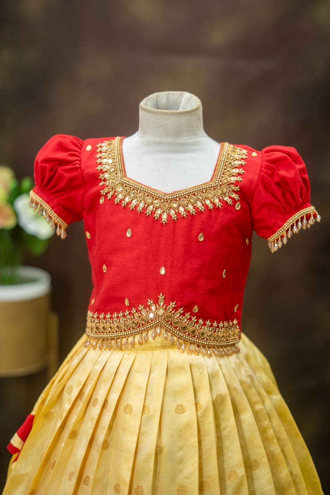 Beautifully crafted semi silk lehanga paired with a rich raw silk top, designed to give a graceful traditional look. The blouse features intricate aari embroidery with delicate bead hanging work, adding a touch of festive charm. Puff sleeves enhance the classic appeal, making it perfect for special occasions. The lehanga comes with a full cotton lining, ensuring comfort for all-day wear. Soft, breathable fabric makes this outfit ideal for weddings, functions, and celebrations.
