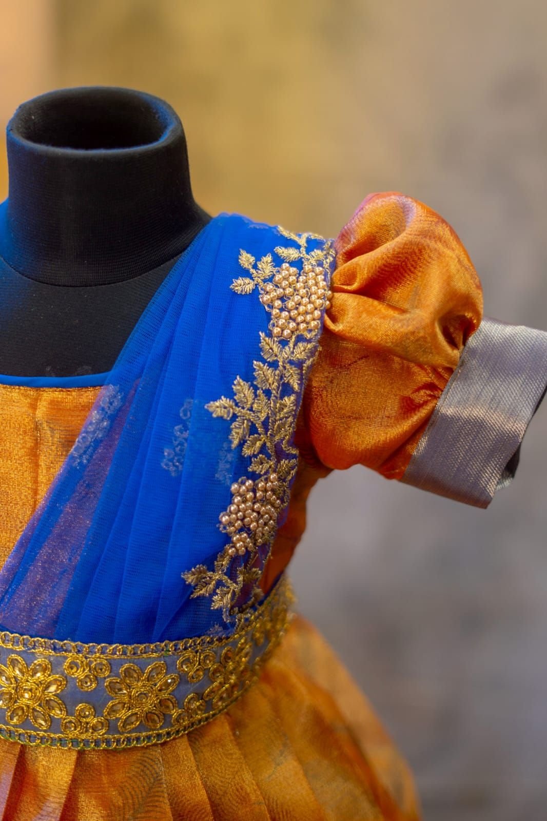 Beautiful Tissue Banarasi frock designed in a charming half-saree style with a detachable dupatta for a graceful traditional look.