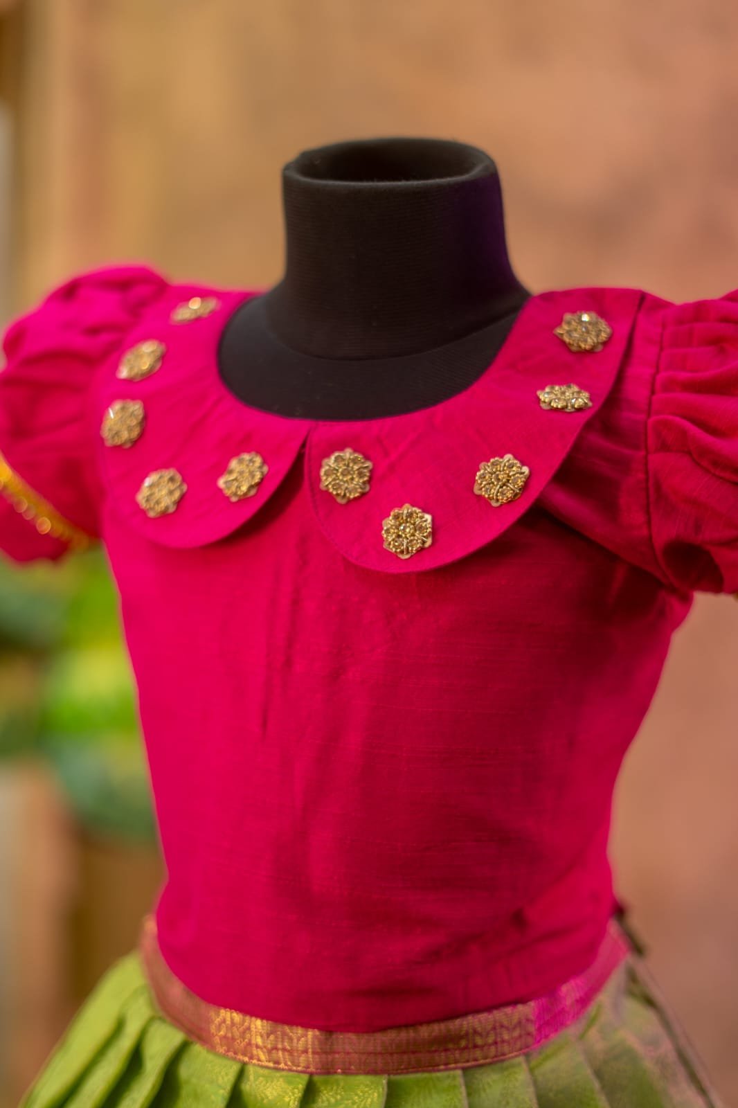 Crafted from luxurious pattu silk, our clothing offers the richness of traditional textiles with the comfort your little one deserves. The fabric is chosen for its soft feel, lustrous sheen, and long-lasting wear, making it perfect for both grand celebrations and casual gatherings.