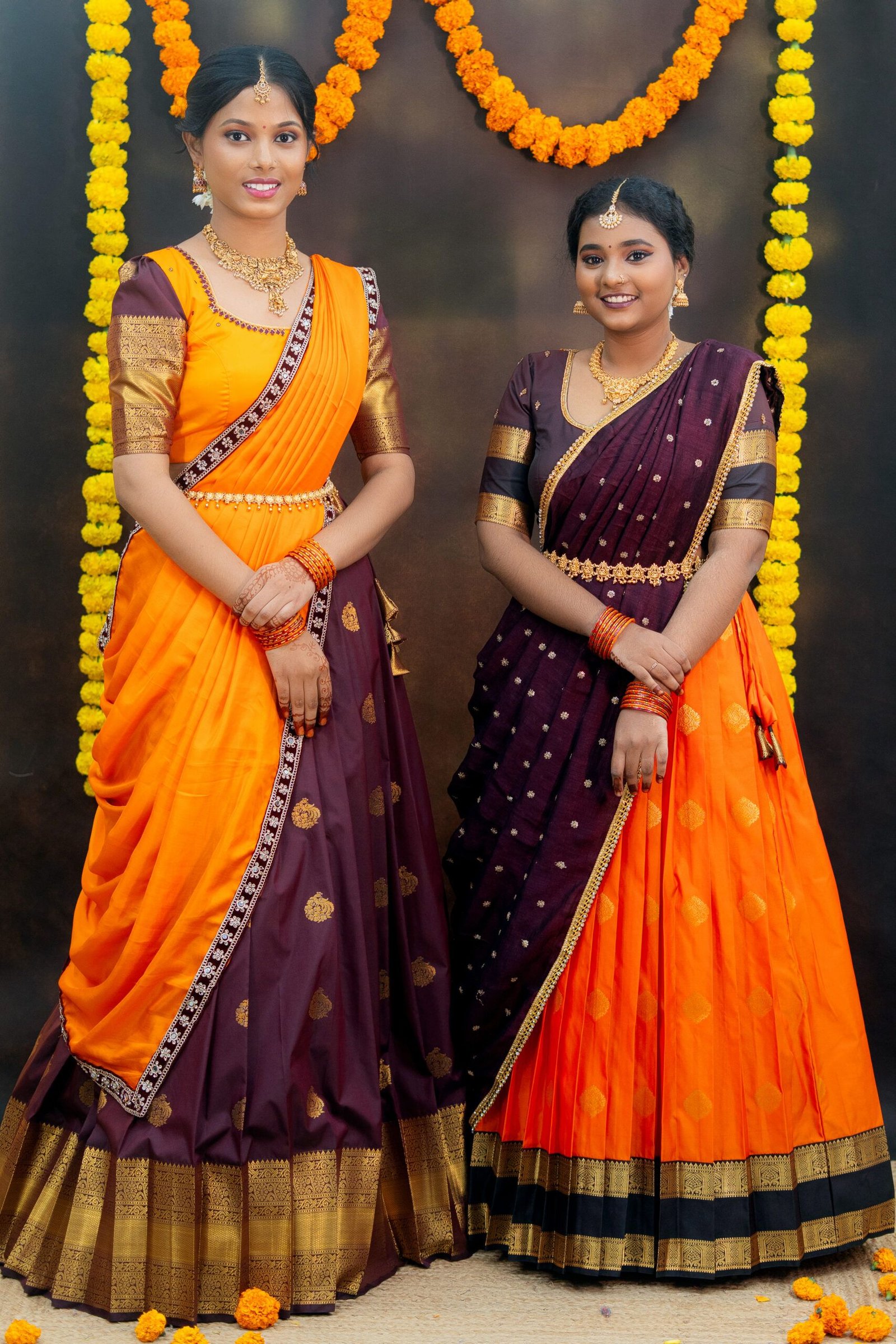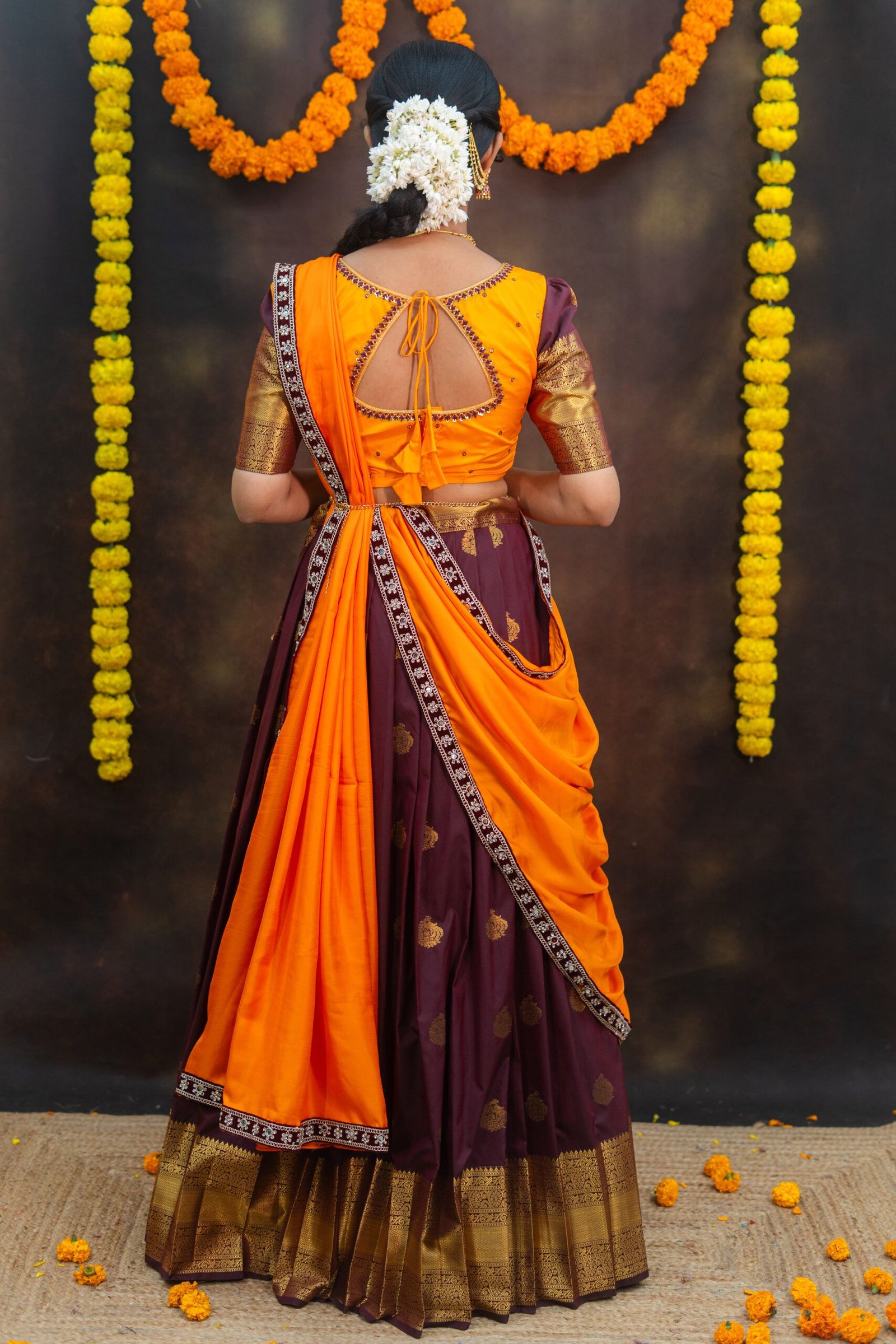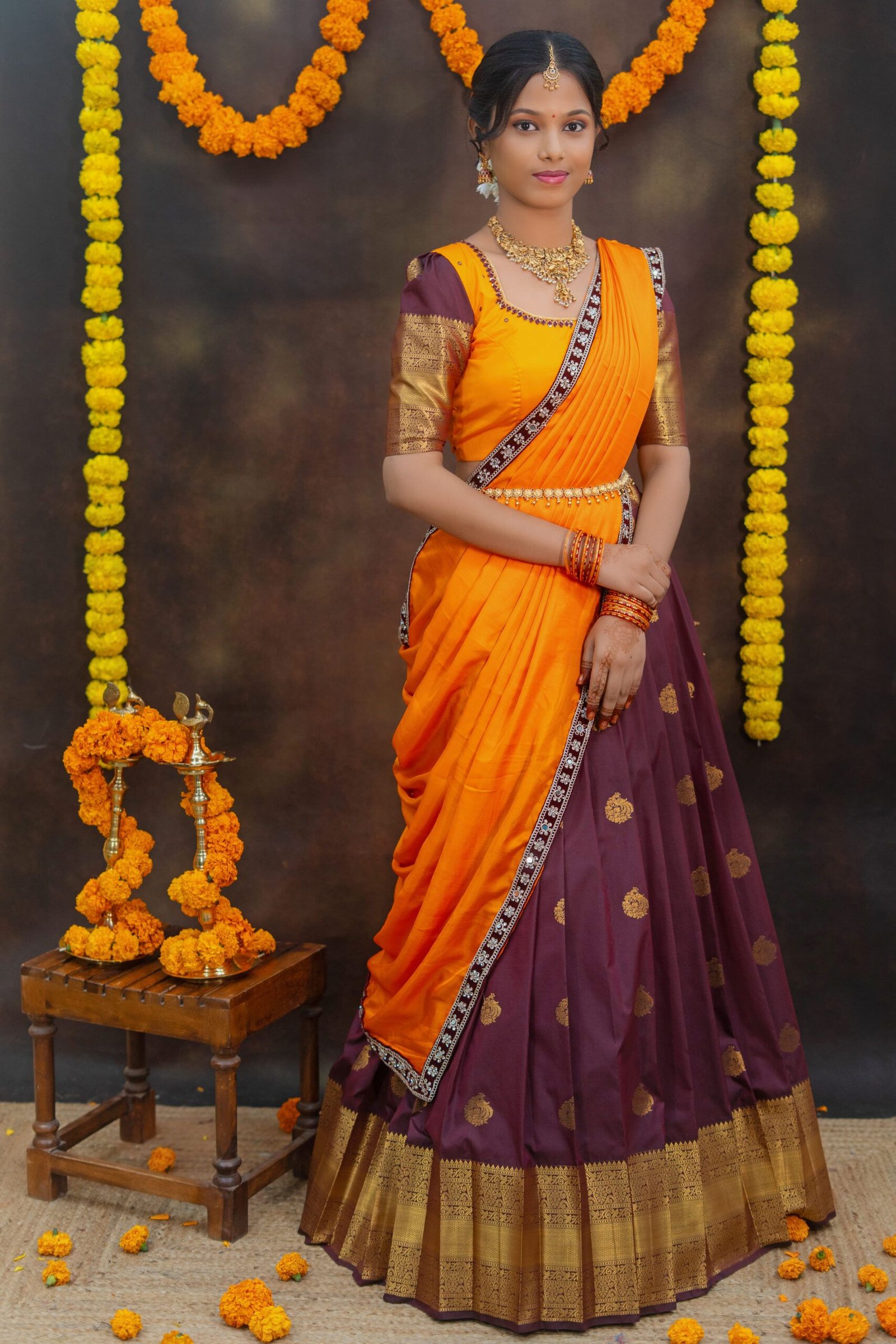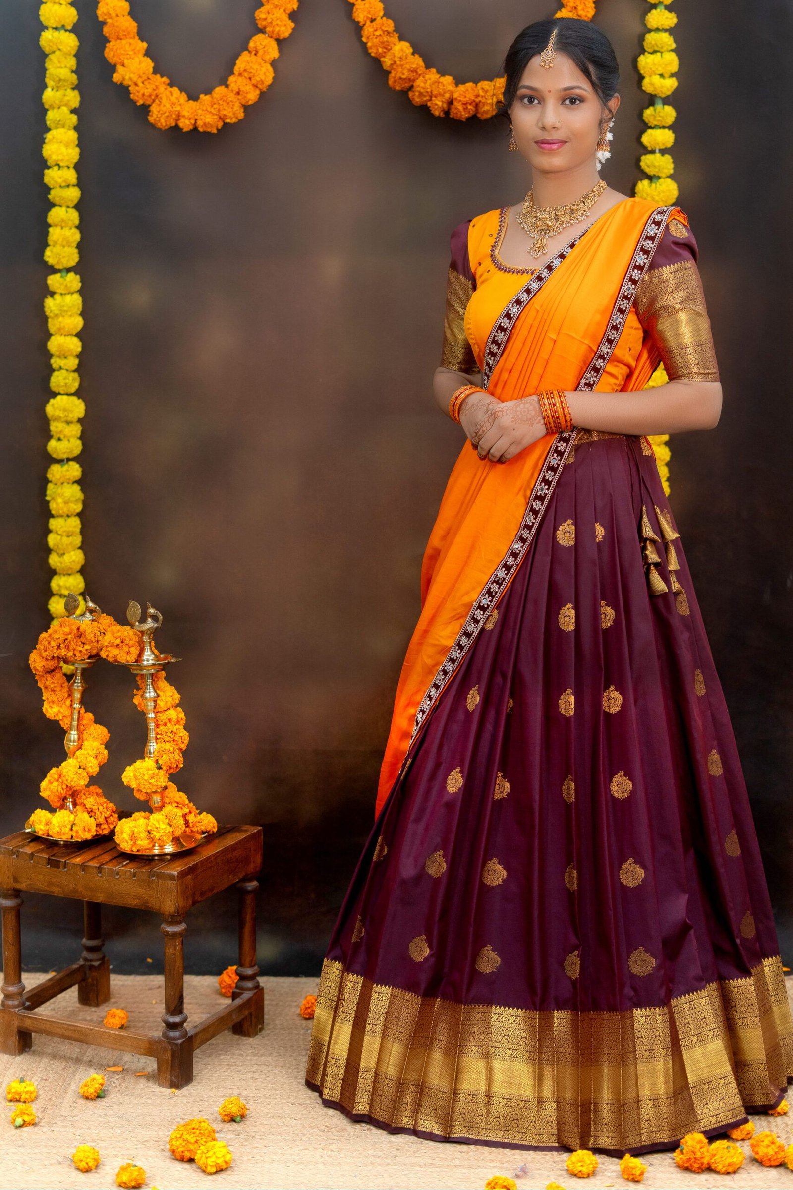 Elegant traditional half saree crafted in a stunning maroon and vibrant orange combination ✨