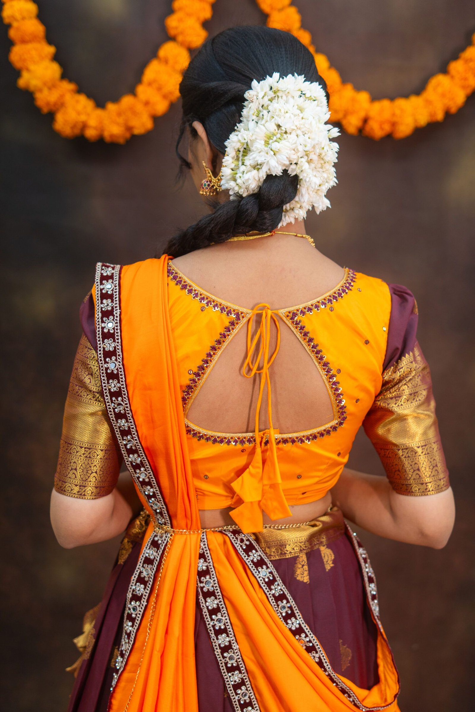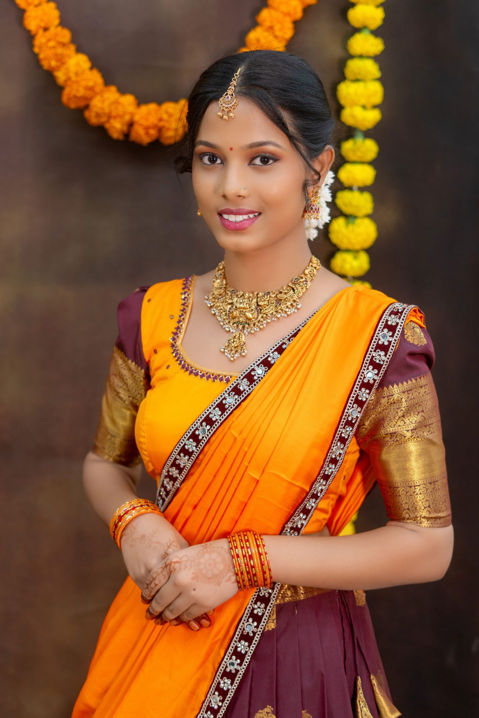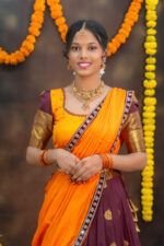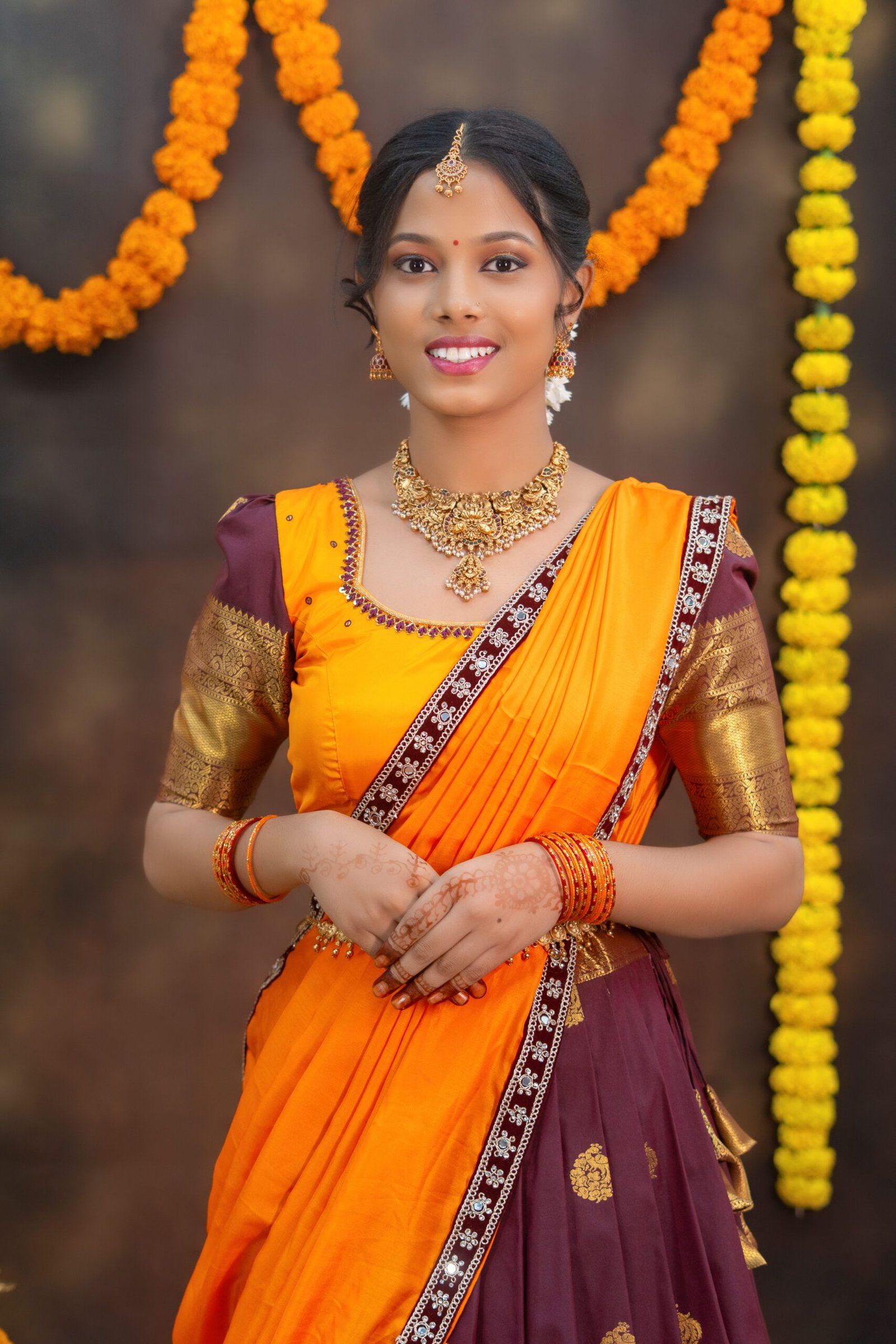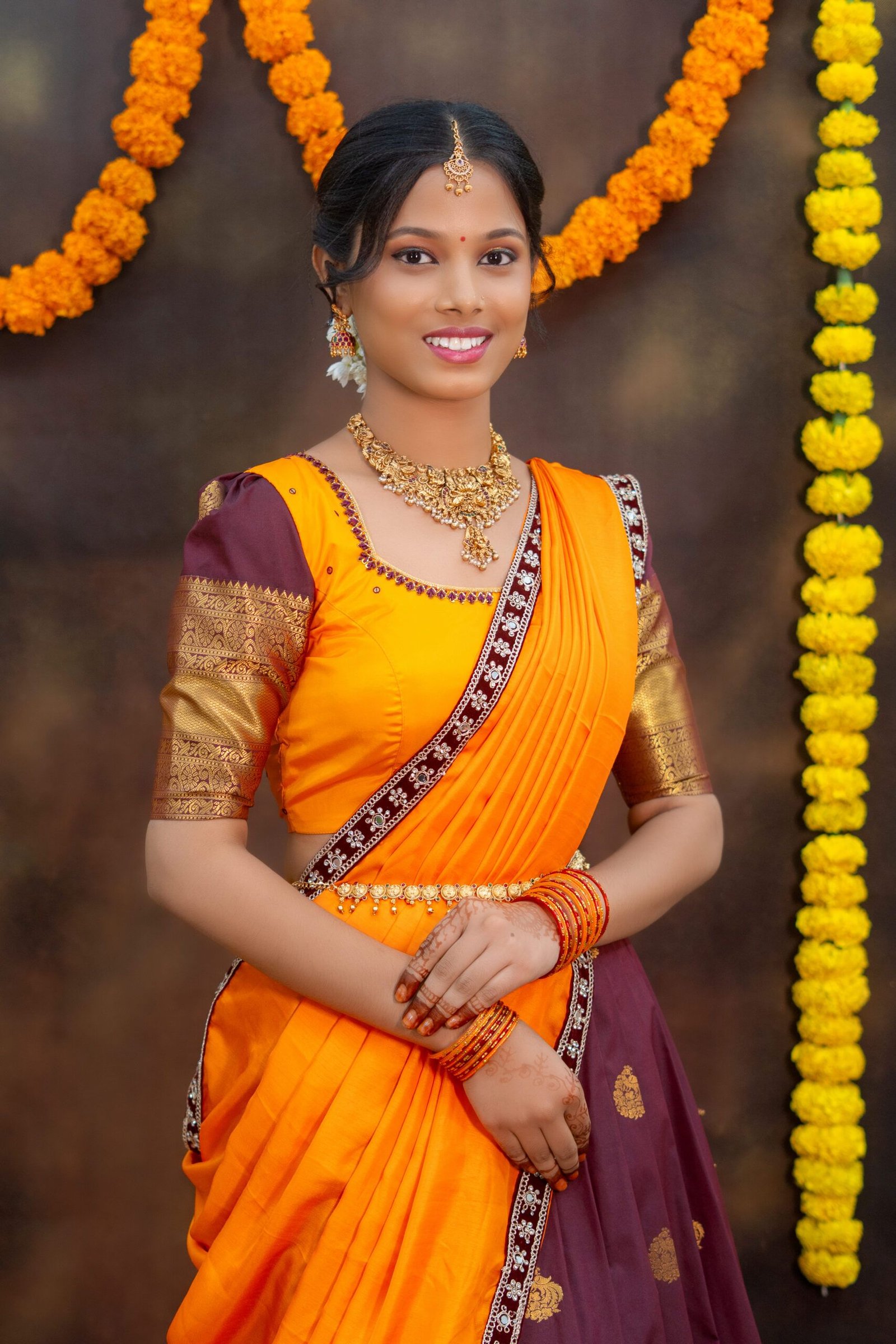 Elegant traditional half saree crafted in a stunning maroon and vibrant orange combination ✨